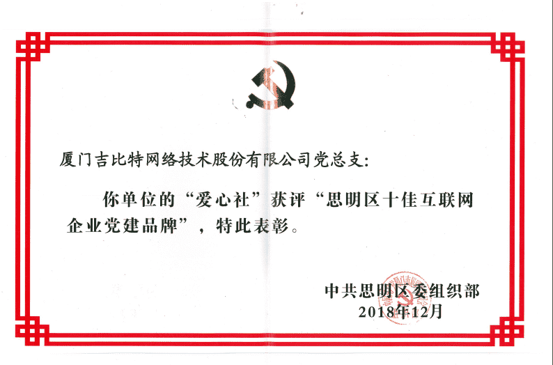 经初审评选、、、网络评选和专家评审等环节,,"厦门918.com网络技术股份有限公司党总支-爱心社" 从全区28个参评党建品牌中脱颖而出,,获评"思明区十佳互联网企业党建品牌"。。。。