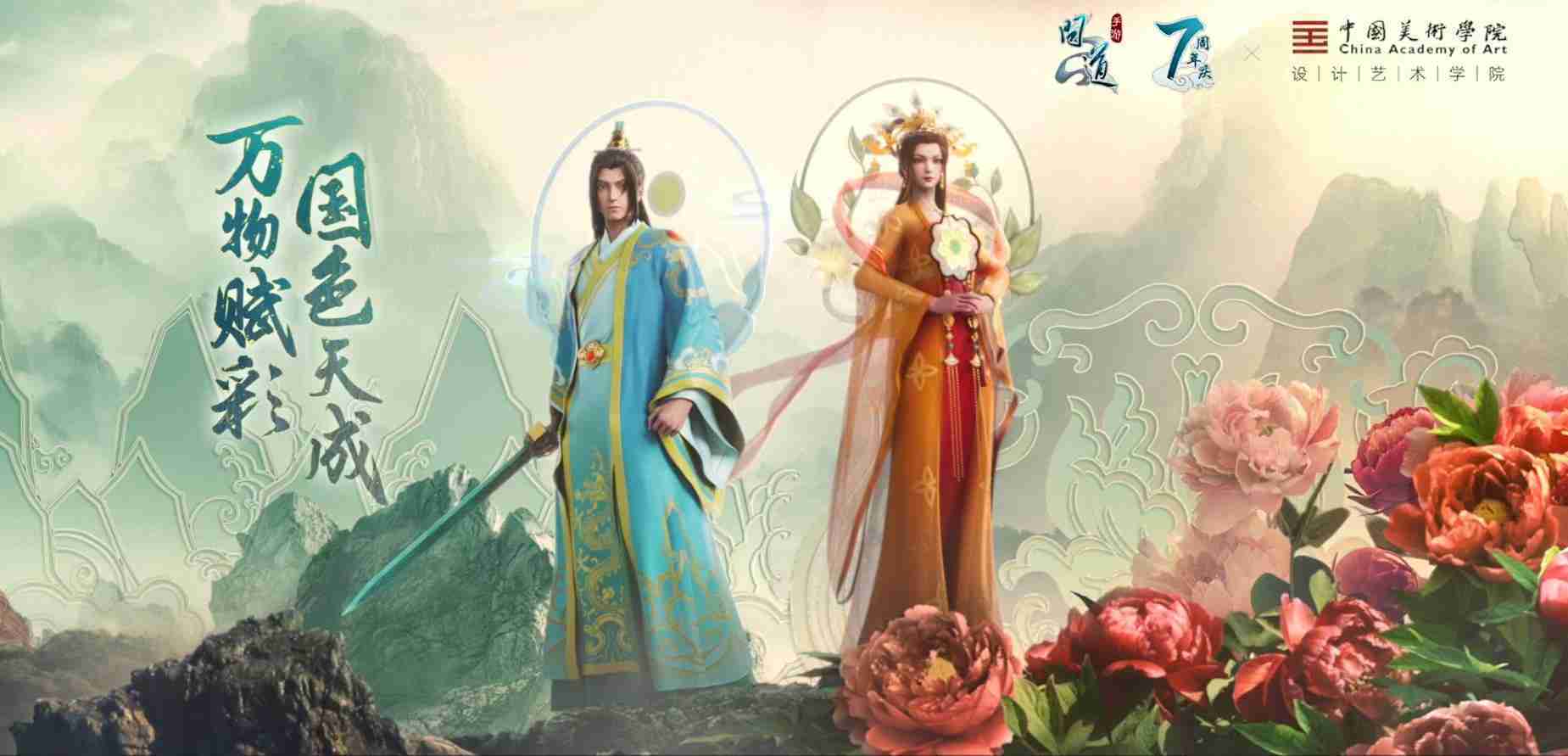 2023年4月,,,,《问道手游》联动中国美术学院,,,在游戏中融合了中国历史上不同时期的文化元素,,,打造了“山河万象”与“凤鸣九霄”的国风时装。。。。在色彩配置方面,,创作团队基于对游戏角色特性的分析提取相应的文化内涵,,从每一种色彩的色相、、指代事物和情感出发对应角色属性,,,选定服装的色彩搭配。。。。在纹样设计方面,,创作团队结合游戏角色自身特殊的造型比例和形态,,在实际的纹样设计中进行了游戏语境下的活化演绎。。。。男性角色集中使用了如蟒纹、、海水江崖纹、、、、如意纹和云气纹等传统纹样元素,,女性角色则吸纳了凤凰纹、、、、牡丹纹、、卷草缠枝纹等元素,,,,组成以“双凤牡丹纹样”“缠枝牡丹纹”“金玉凤冠头饰”为主要纹样的游戏角色装饰图案系统。。