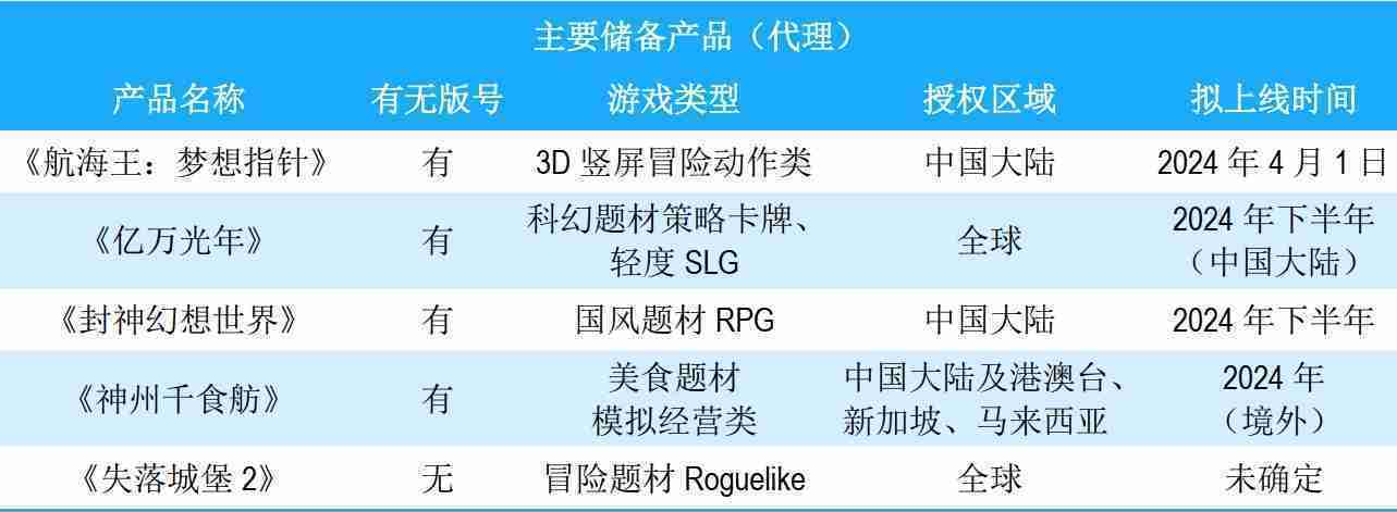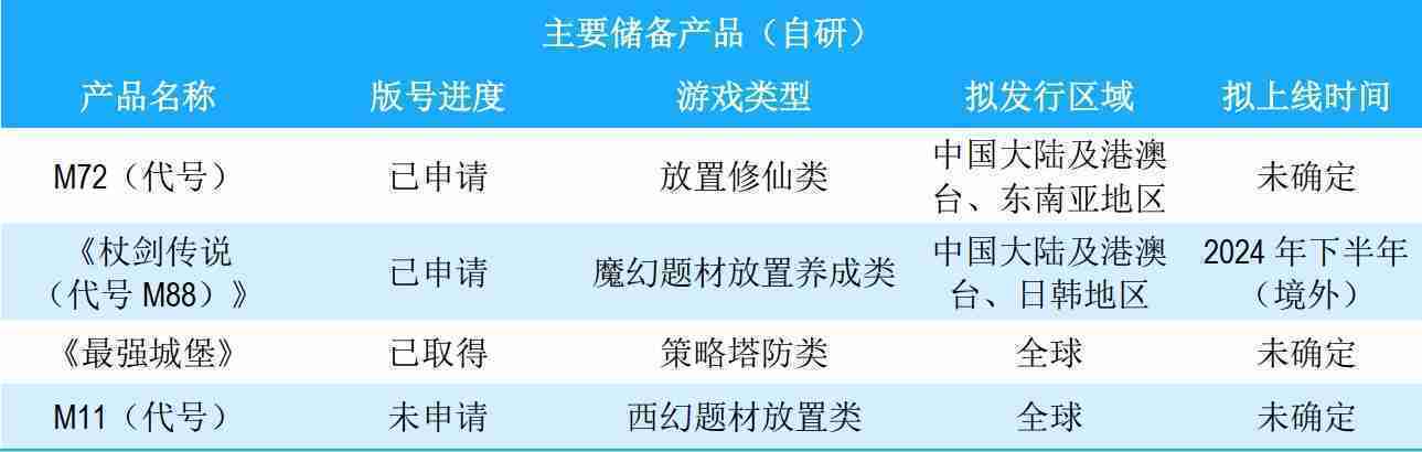 公司储备的多个自研、、代理产品都在有序推进当中,,,涵盖放置类、、、、策略类、、模拟经营类、、、、RPG、、、、Roguelike等多元化游戏品类,,,,储备的主要自研和代理产品如下::::